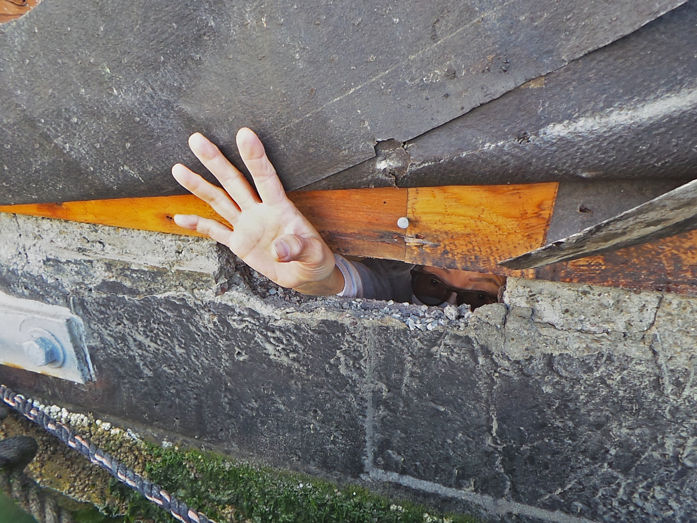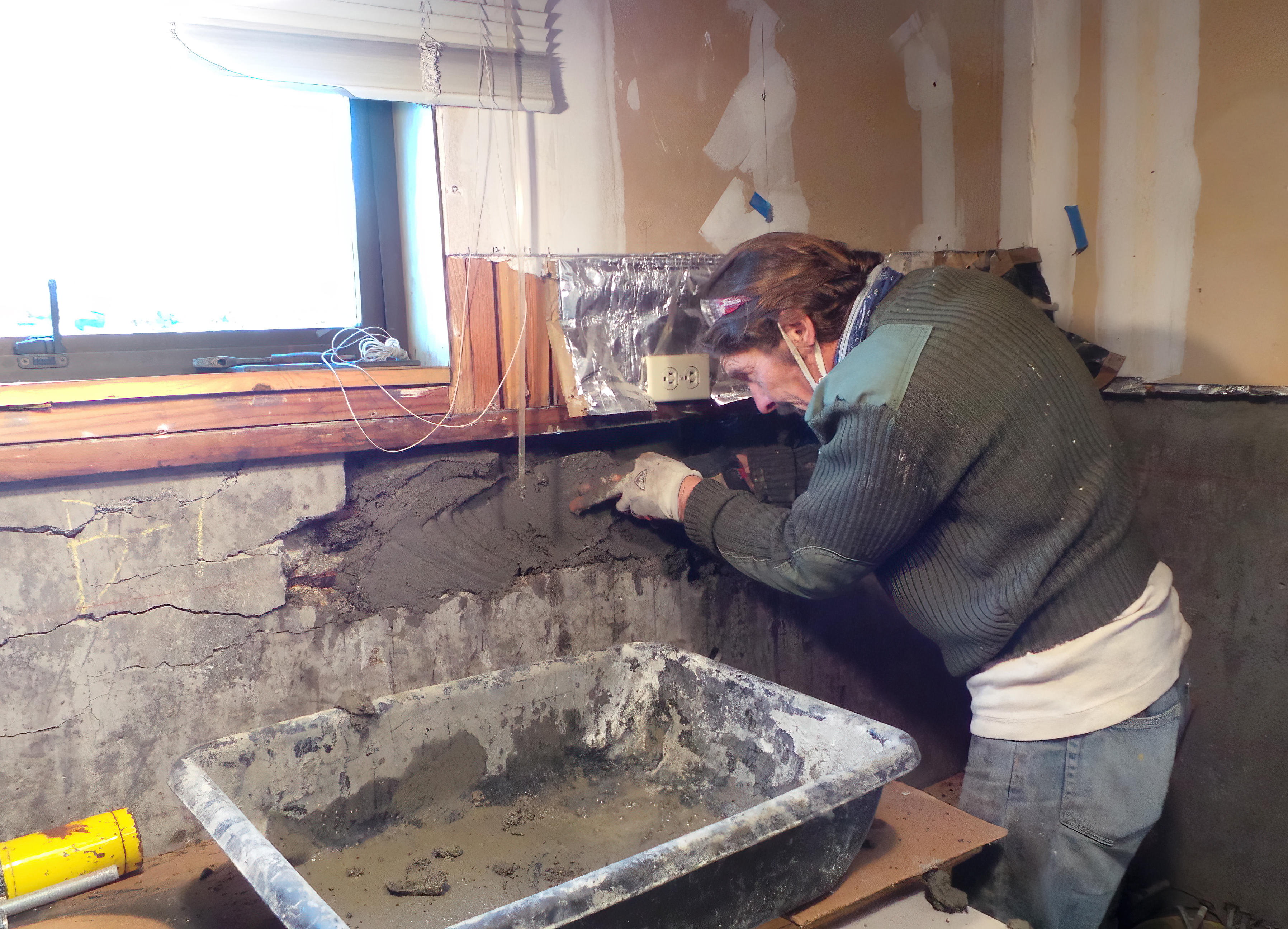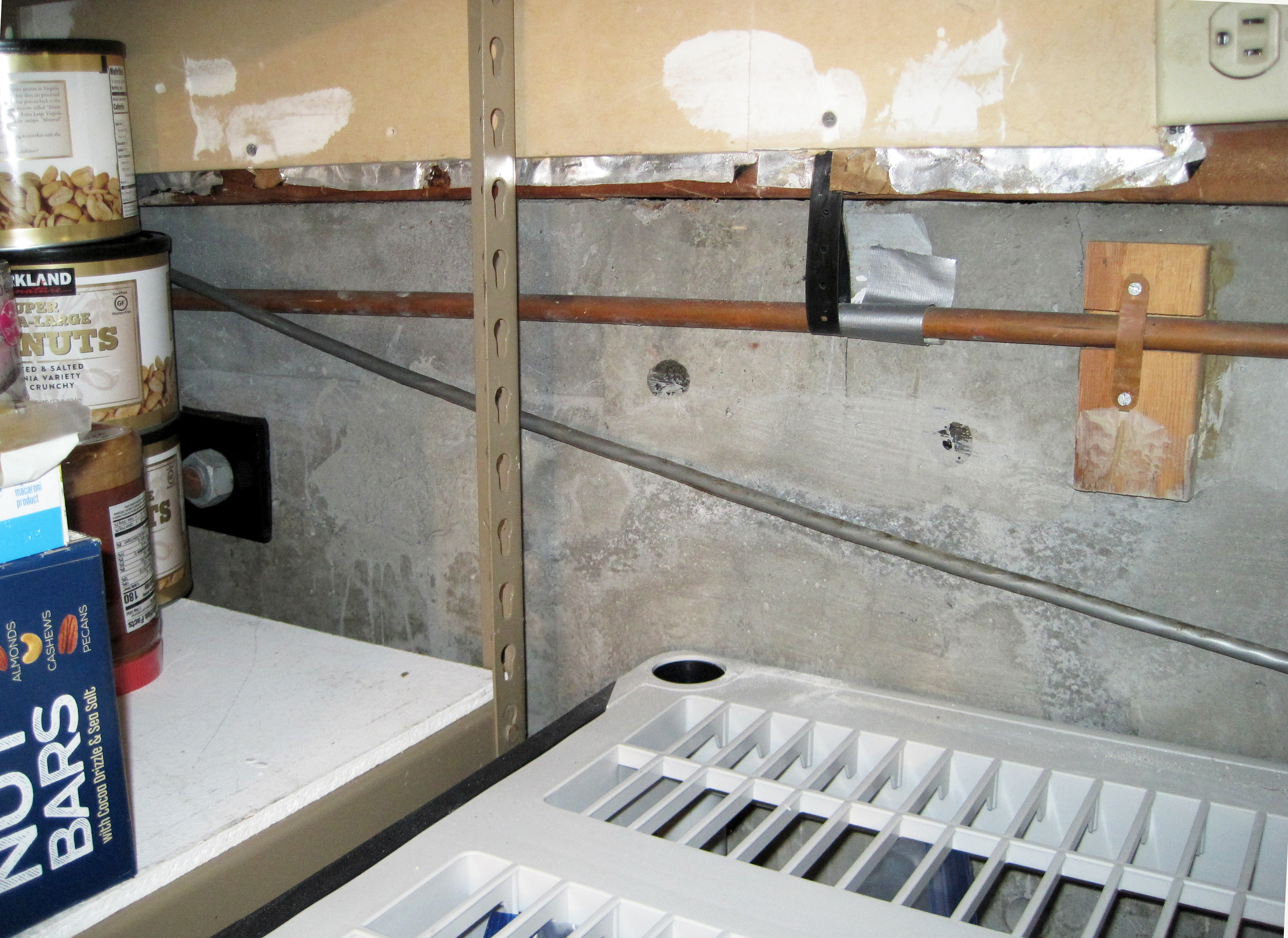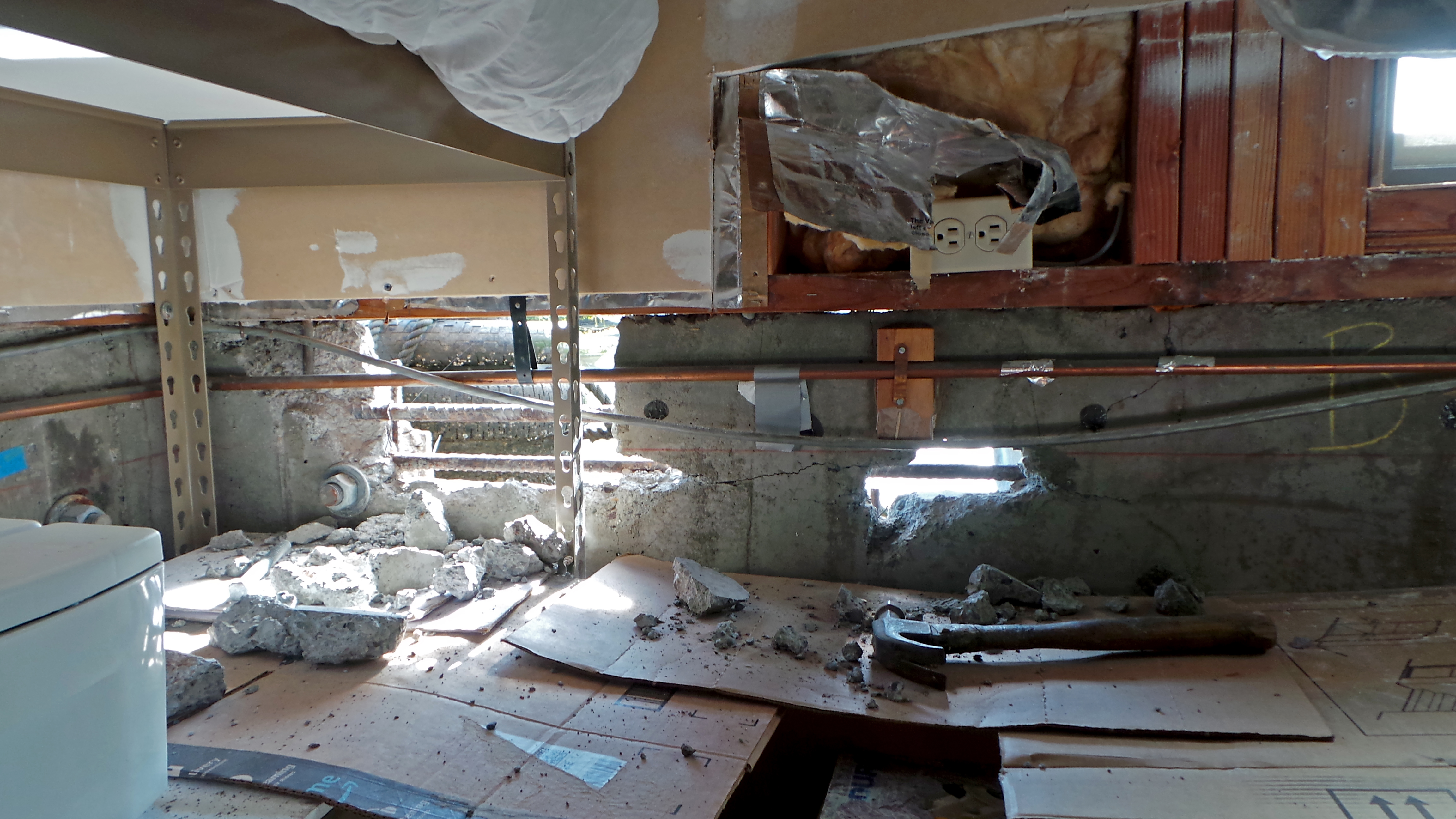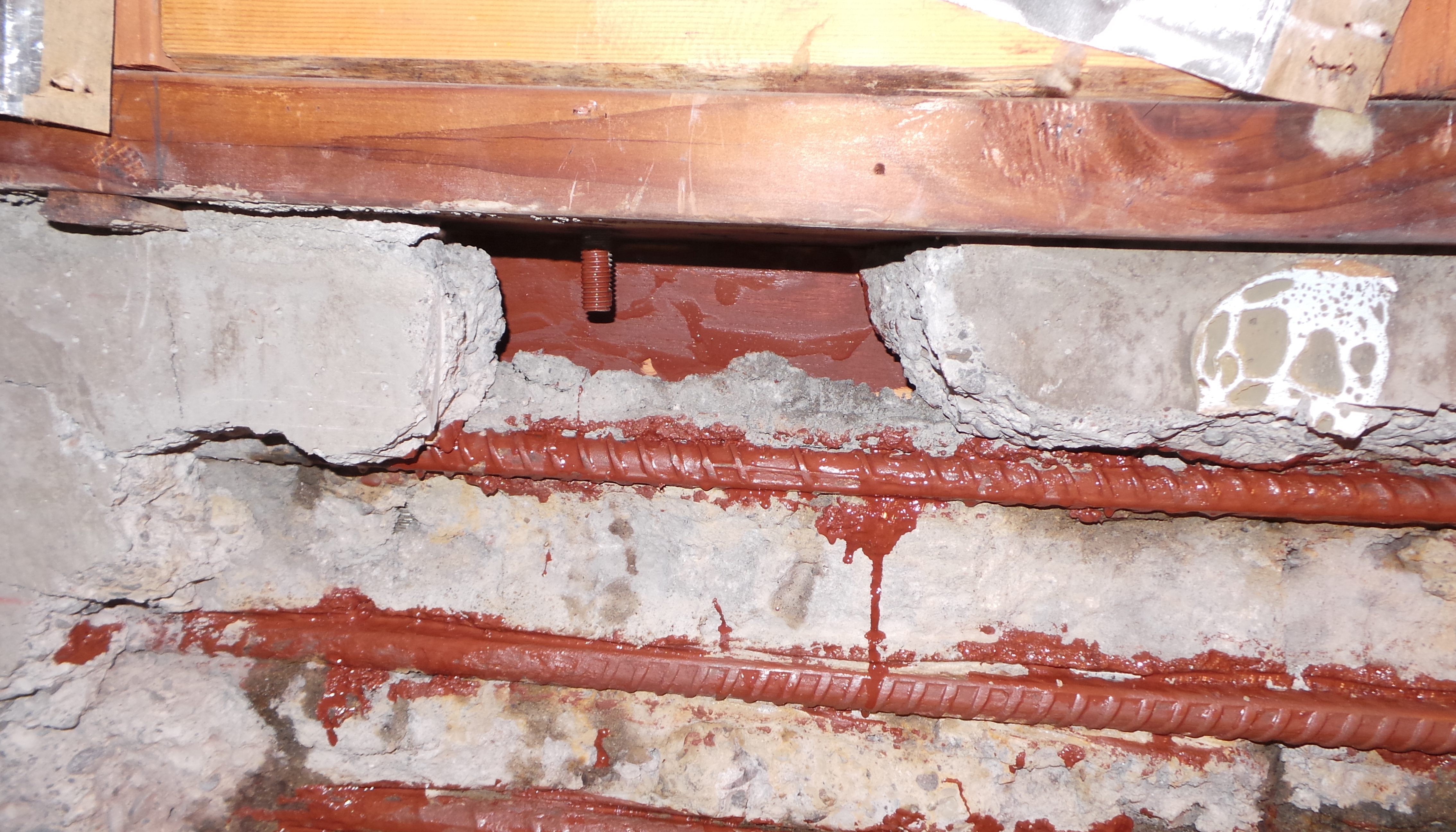 Demo of an 8' span of 5 1/4" thick concrete, 25" high area of spalled concrete removed down to where un-oxidized or salvagable rebar with minor oxidation was reached. All unsalvagable steel reinforcement , both vertical and horizontal, were removed. Vertical steel reinforcement replaced with 3/4" galvanized all-thread. Horizontal steel replaced with #4, 1/2" steel rebar.